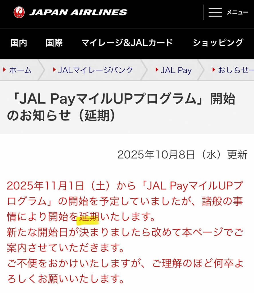 【延期でラッキー?】JAL Payの還元率ダウンが 11/1 になっても始まらない