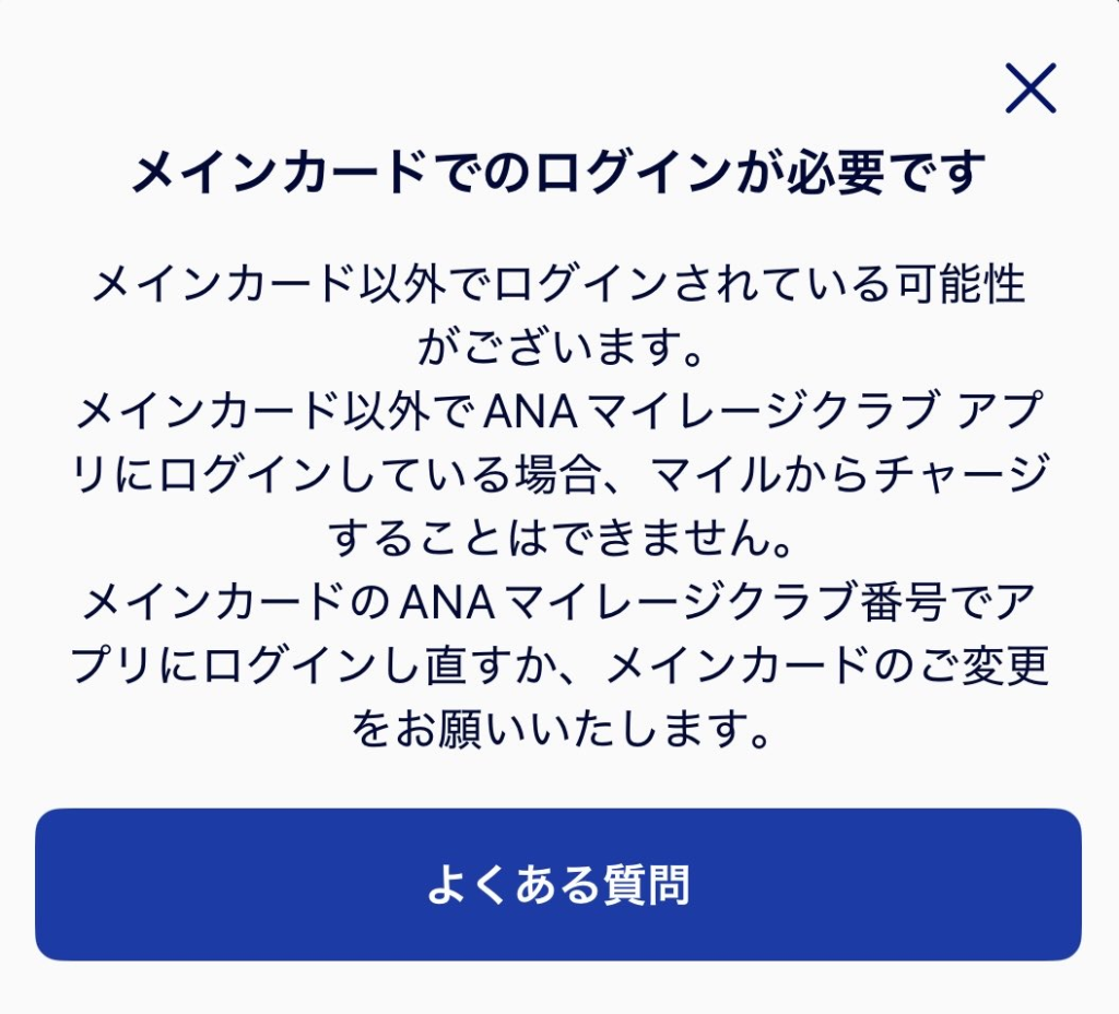 【対処】ANA Pay マイルチャージ時「メインカードでのログインが必要です」