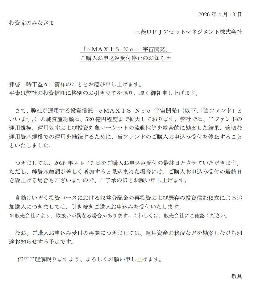 🚀宇宙関連銘柄に投資する投資信託「eMAXIS Neo 宇宙開発」が新規受付停止となります。 運用会社の案内 私は、投資信託の積立で、宇宙関連の投資信託を少しだけ含めています。 📝新規受付停止の概要・4/17までの購入申込みをもって受付停止(さら… -