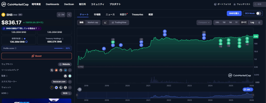 「BNB(ビルドアンドビルド)」は、現在はBNB Chainの基軸トークンとして、様々なWeb3サービスの利用を支えています。2026年1月現在、1BNBあたり約14万円の価値があり、昨年は過去最高値を更新しました。時価総額は1,230億ドル超と、スマートコントラクト分野で2位の規模で、国際的に取引が行われています。