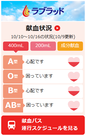 献血に協力できる方は、ラブラッドに登録の上、献血ルームや献血バスへ。