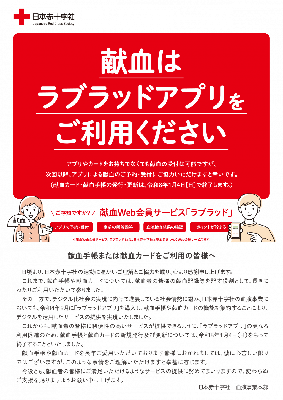 2026年1月4日をもって、献血カードと献血手帳の発行/更新が終了予定です。アプリに移行しましょう。