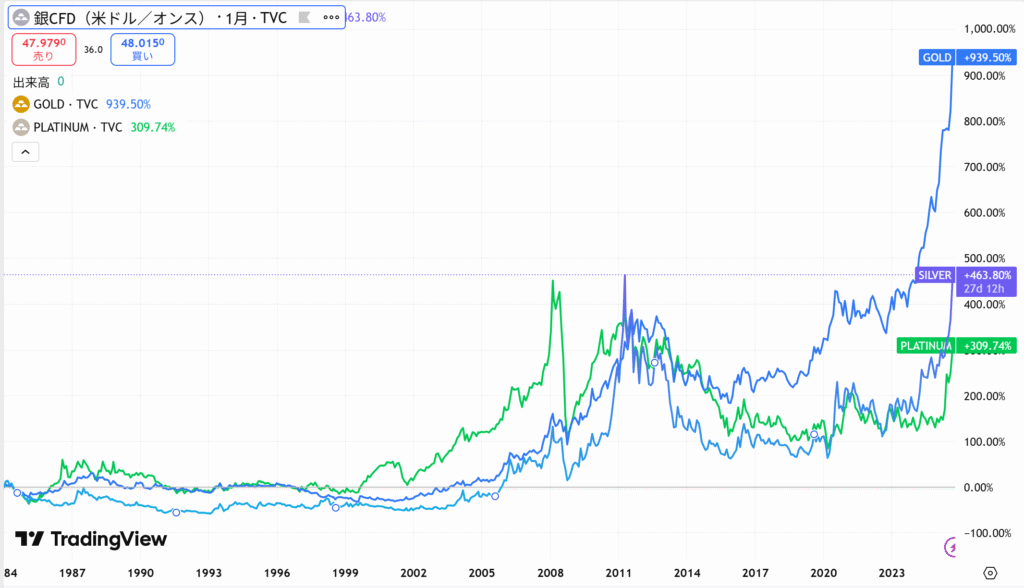 以下は銀とゴールドとプラチナのUSDでの価格推移(パーセント表示なので実価格ではありません)。