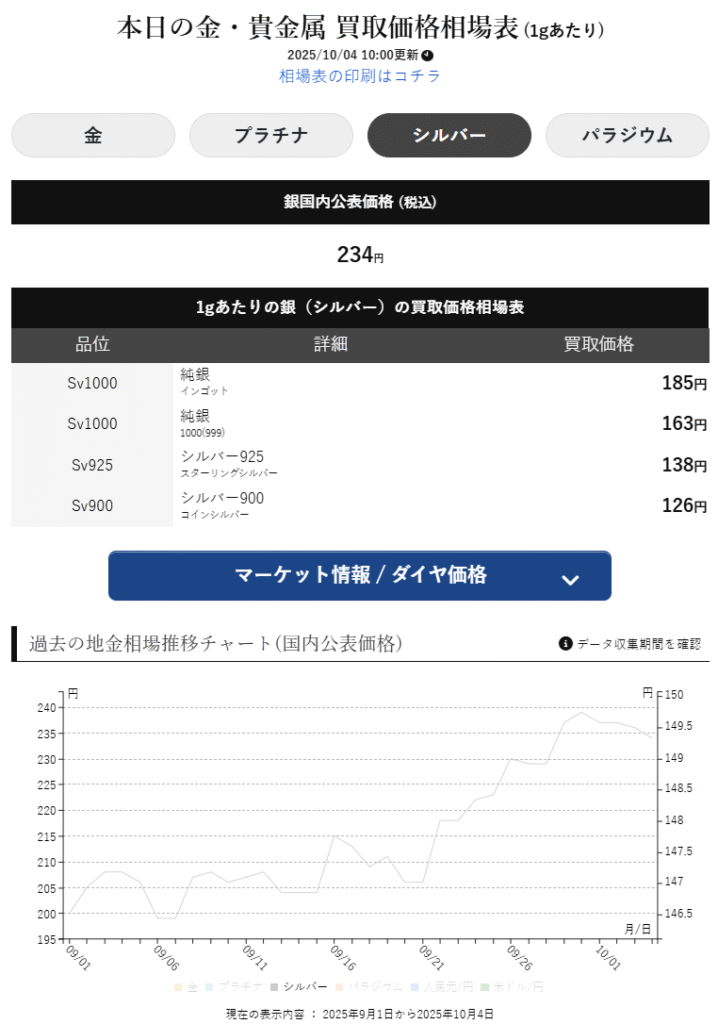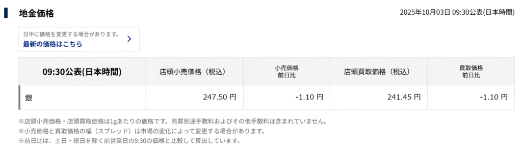 例えば、2025年10月4日時点で確認した田中貴金属での銀の地金価格だと、店頭小売価格と店頭買取価格の差(スプレッド)が6.05円ありました(後述しますが売却時はさらに重量に応じ手数料がかかります)。