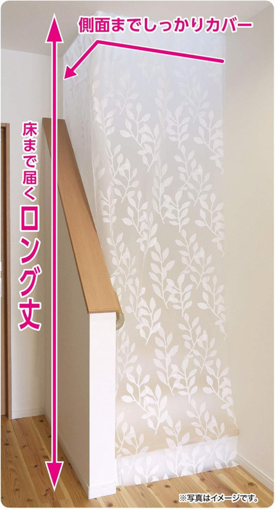 以下は、リビング階段部分を塞いだ例です。この写真は、後述する間仕切りカーテンの商品画像です。実際の我が家の階段では、手すり下にスリットがあったり、階段周辺に梁があったりと複雑な形状なので、間仕切りカーテンと面ファスナーをカットして、スキマを埋められるようになんとか固定しています。