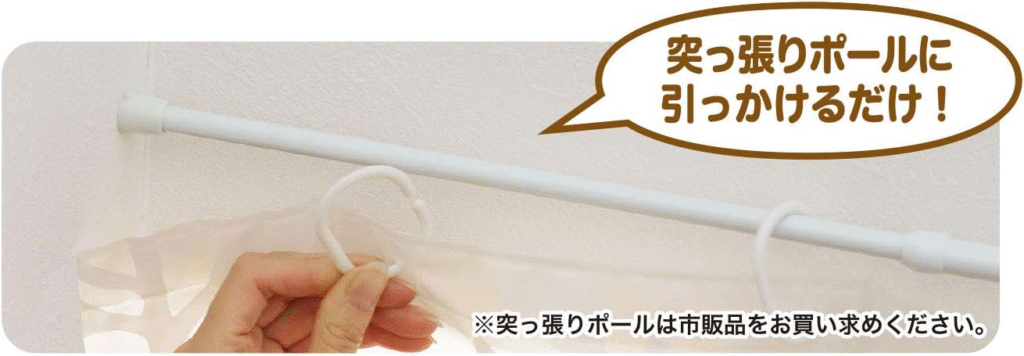 あと、間仕切りカーテン端を壁などに固定するための方法として、我が家では面ファスナーを使用しました。その他、フックのようなものを使用するパターンもあるかと思いますが、面ファスナーの方がスキマ無く固定でき、密封効果が高いと思います。