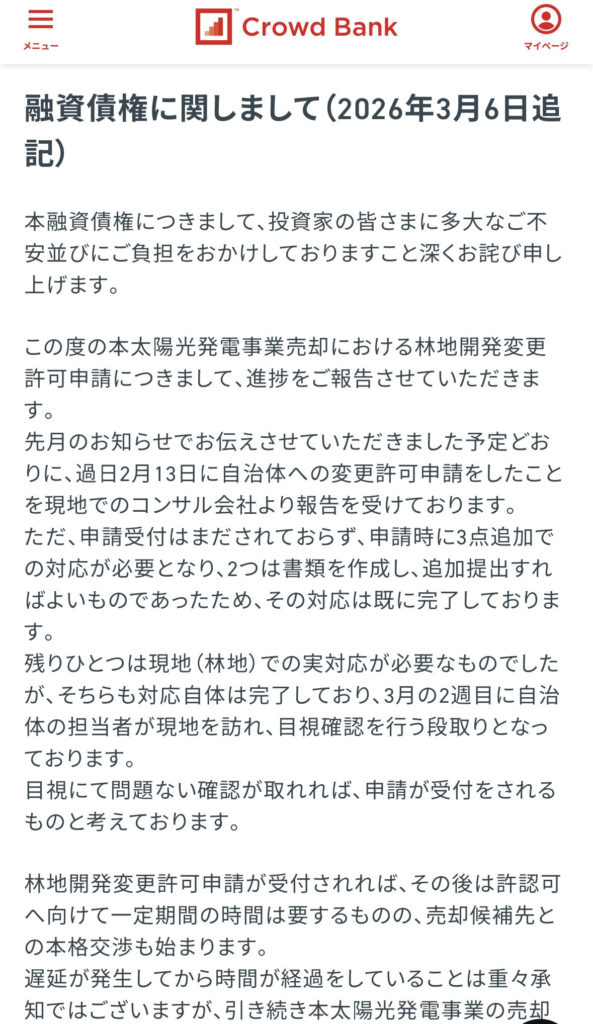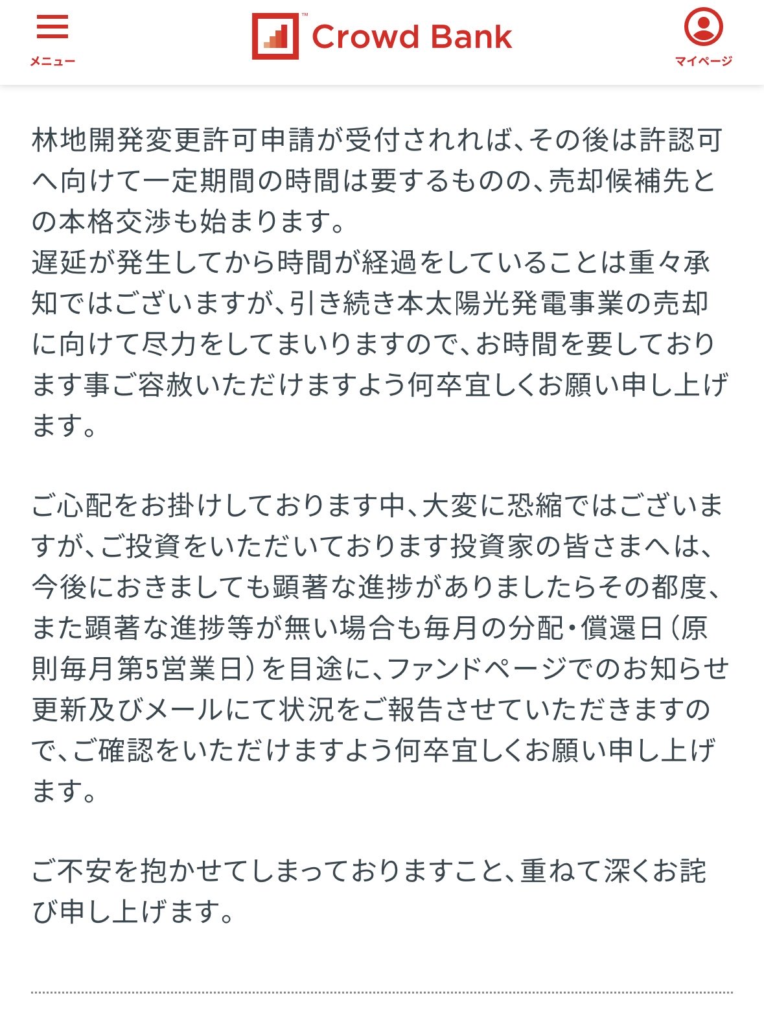 ⚠️クラウドバンクの太陽光発電ファンドの融資返済、引き続き遅延中