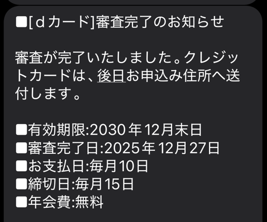 - 審査完了時点で入会済み(審査完了日=入会日だった)になるのに、カードが届くまでカード番号が分からないのは不便(一応、カード到着前でもd払いに利用できたり、ドコモ回線があればカード到着前にApple Pay登録できたりはするけど、非ドコモユーザのカード発行体験としてはイマイチ)。公式サイトには、審査は最短5分で完了という記載はあるけど。