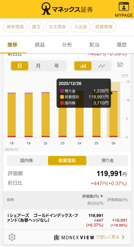 獲得したポイントのうち10万P分はマネックス証券でゴールドの投資信託を購入、放置しようかと思います。この時点で20,000円くらいプラスになってます。今年はゴールドの価格上昇がすごかったですね。