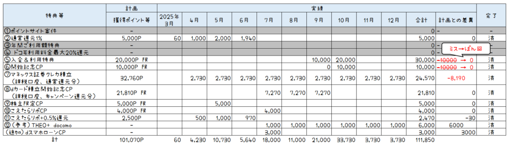 | 2025年10月 | 0円 | 3,730P(通常P) 20,000P(期間限定P) ※ミス挽回?(後述) | – |