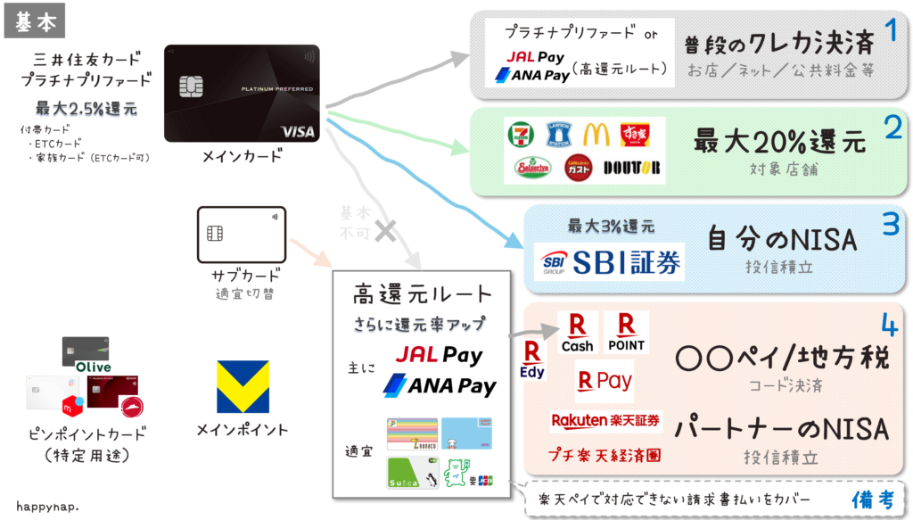 家計をシンプルに管理しつつポイント還元率を高めるため、“ポイント特化型” を謳う三井住友カード プラチナプリファードをメインカードとして使用します。