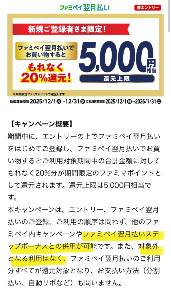 ファミペイ翌月払いの新規契約者向けのキャンペーンです。