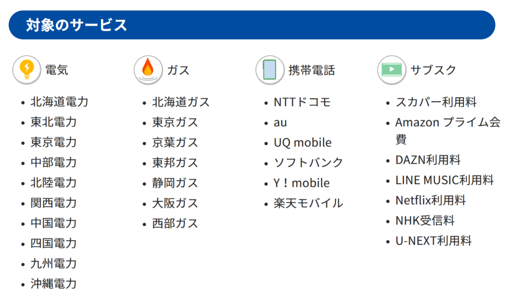 電気・ガス・携帯電話・サブスクの支払い1件あたり1,500P。上限6,000P(4件、1件あたり100円以上)です。