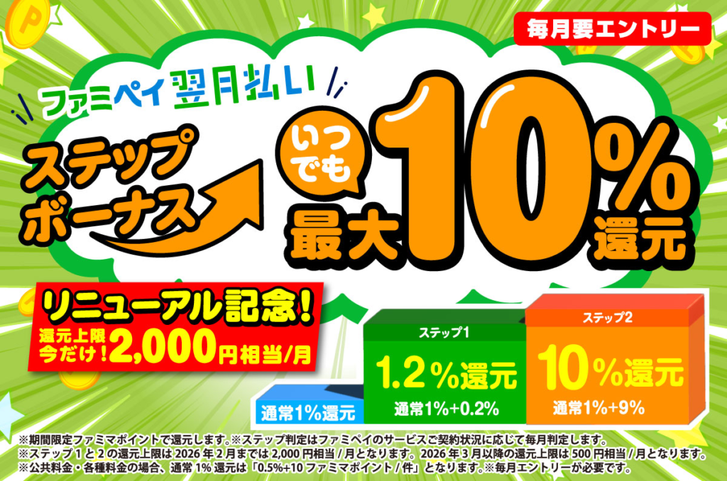ファミペイ翌月払いのステップボーナスのリニューアル記念のキャンペーンです(Xで教えていただきました、ありがとうございます)。