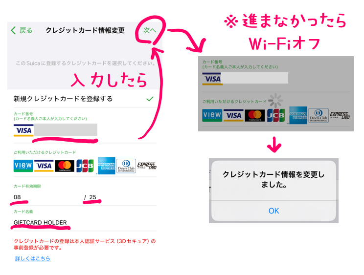 クレジットカード情報変更の画面で、先ほど確認したVisa eギフトのカード番号等を入力し、次へを選択します。