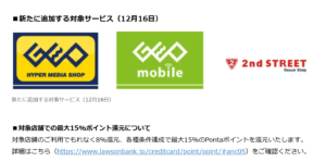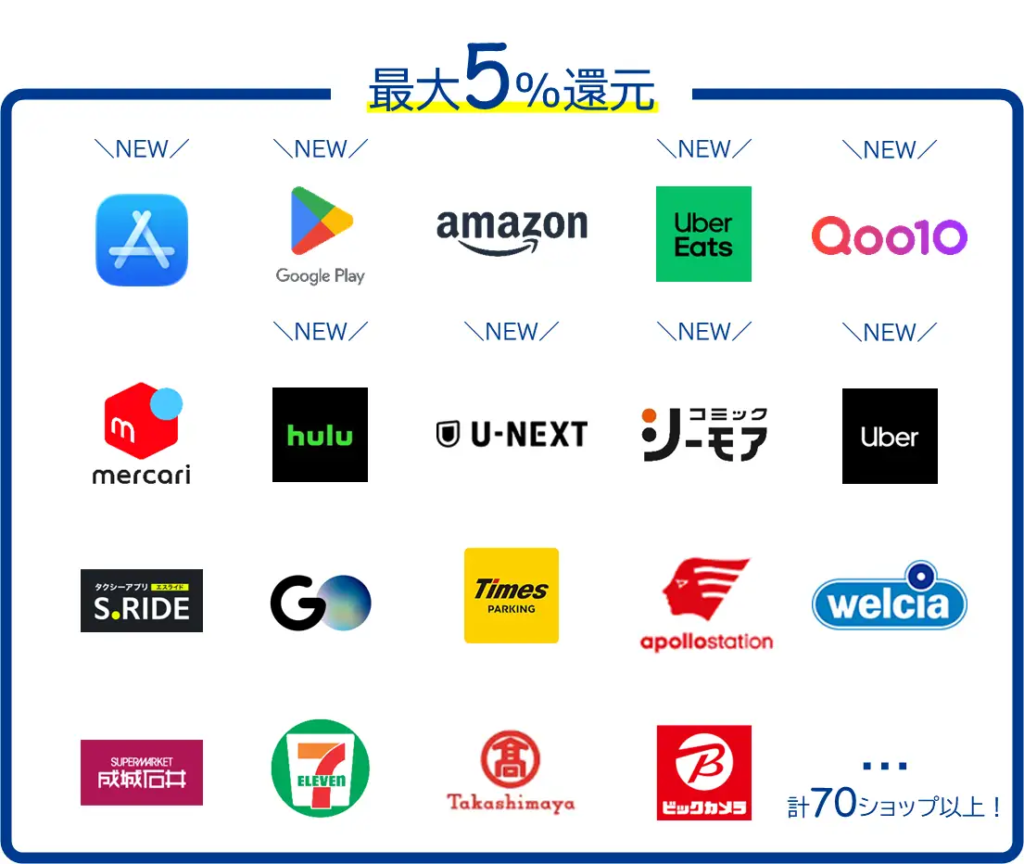 | 1.0%(2倍) | アポロステーション、ウェルシア、成城石井、タイムズパーキング*4、ビックカメラ、メルカリ |