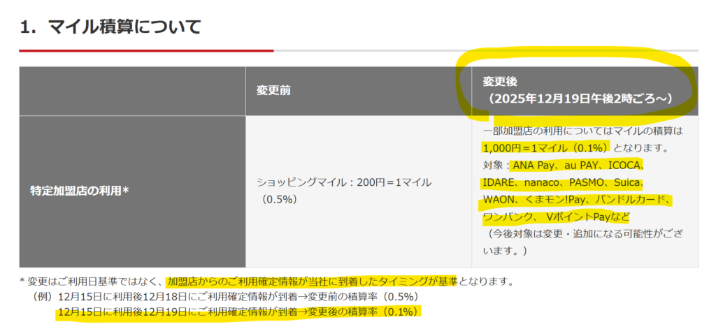 延期になっていたJAL Payでの各種チャージ系利用時の還元率ダウンが2025年12月19日午後2時に適用されることになった件についてでした。
