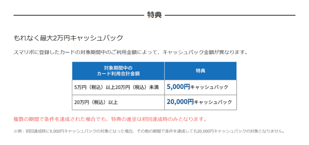 スマリボと言えば最大10%還元に相当する20,000円キャッシュバック。これは継続です。