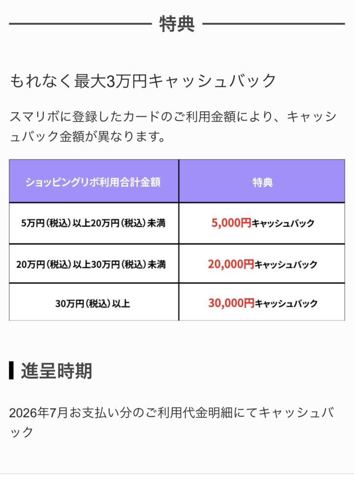 こんな感じで、対象となるリボ払いの利用金額の額に応じ、最大30,000円のキャッシュバックを受けられます。最近の開催では上限がずっと合計20万円(キャッシュバック 2万円)でしたが、今回はその上限が +10万円(キャッシュバック +1万円)となっています。