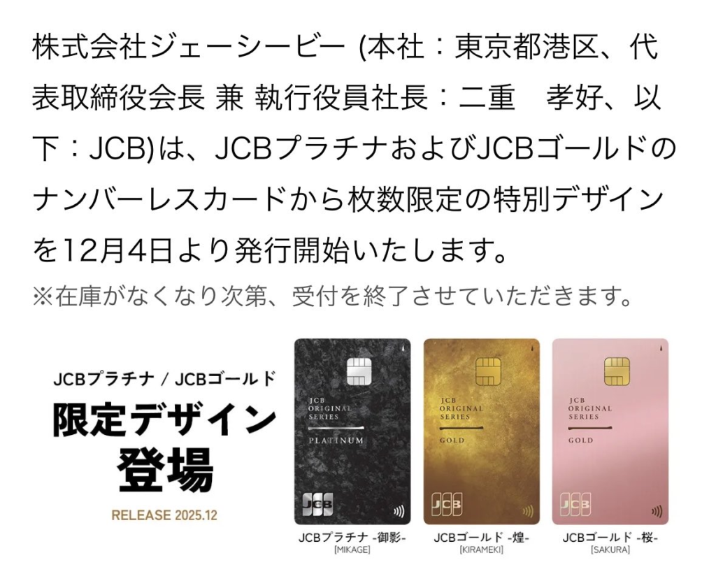 あ、そう言えば最近、枚数限定の特別デザインのJCBカードが発表されましたね。この券面デザインは、在庫がなくなり次第、受付終了とのこと。