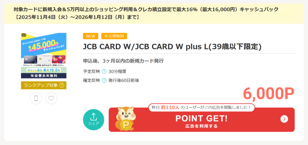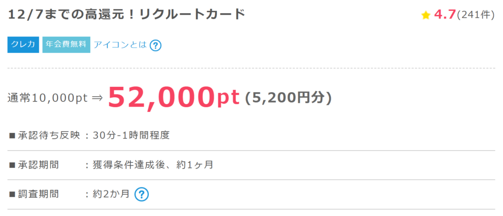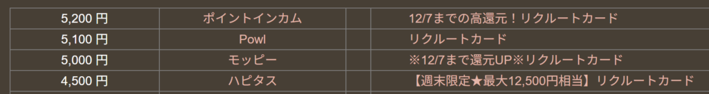 ちなみに、リクルートカードはポイントインカムで5,200円分の案件があります。12/7まで。