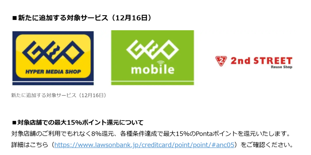 株式会社ローソン銀行のプレスリリース(2025年12月16日 10時00分)クレジットカード「ローソンPontaプラス」の最大15%ポイント還元対象店舗にゲオグループの「GEO」「GEO…