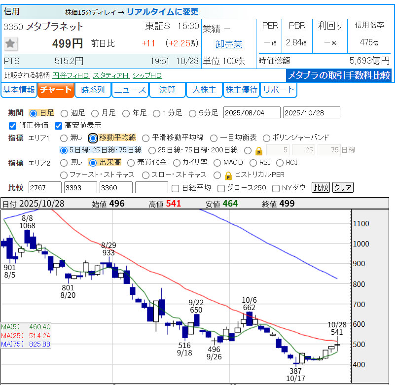 2025年10月17日時点で、試しにメタプラネットの株式を現物で100株だけ購入してみました。1株393円でした。