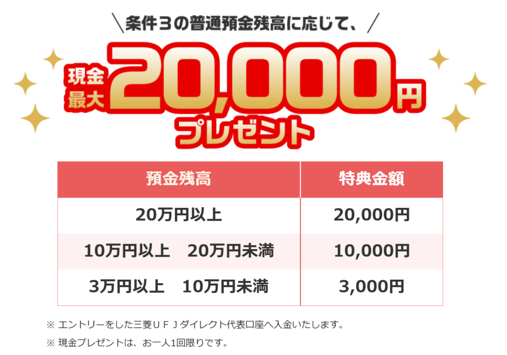 支払口座に三菱UFJ銀行口座(エントリーしたダイレクト代表口座)を設定 - 2026年3月31日23:59時点で、普通預金残高が3万円 or 10万円 or 20万円以上