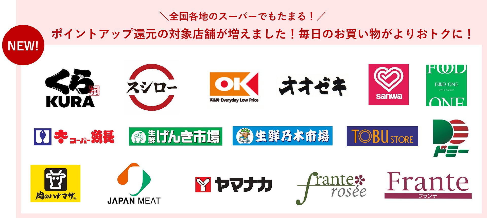 (※) 追加になるスーパーマーケット:オーケー、オオゼキ、三和、フードワン、スーパー魚長、生鮮げんき市場、生鮮乃木市場、東武ストア、ドミー、肉のハナマサ、ジャパンミート、ヤマナカ、フランテ、フランテロゼ (同じ系列の店舗もカウントされて計14)