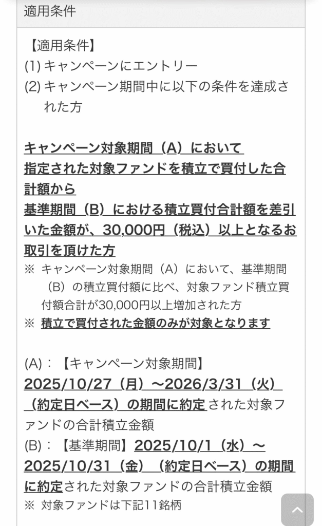 これらの対象ファンドで、2025年10月27日 ~ 2026年3月31日(約定日ベース)の約5か月間の積立金額合計が、10月単月の積立金額より30,000円以上増加していれば応募できます。