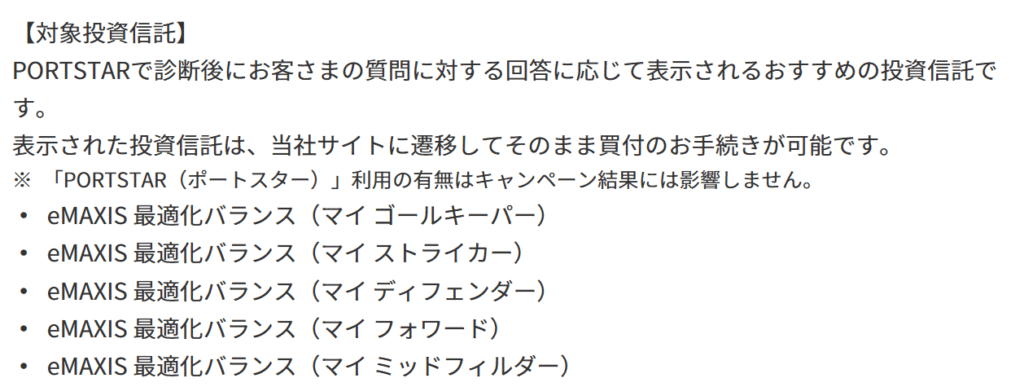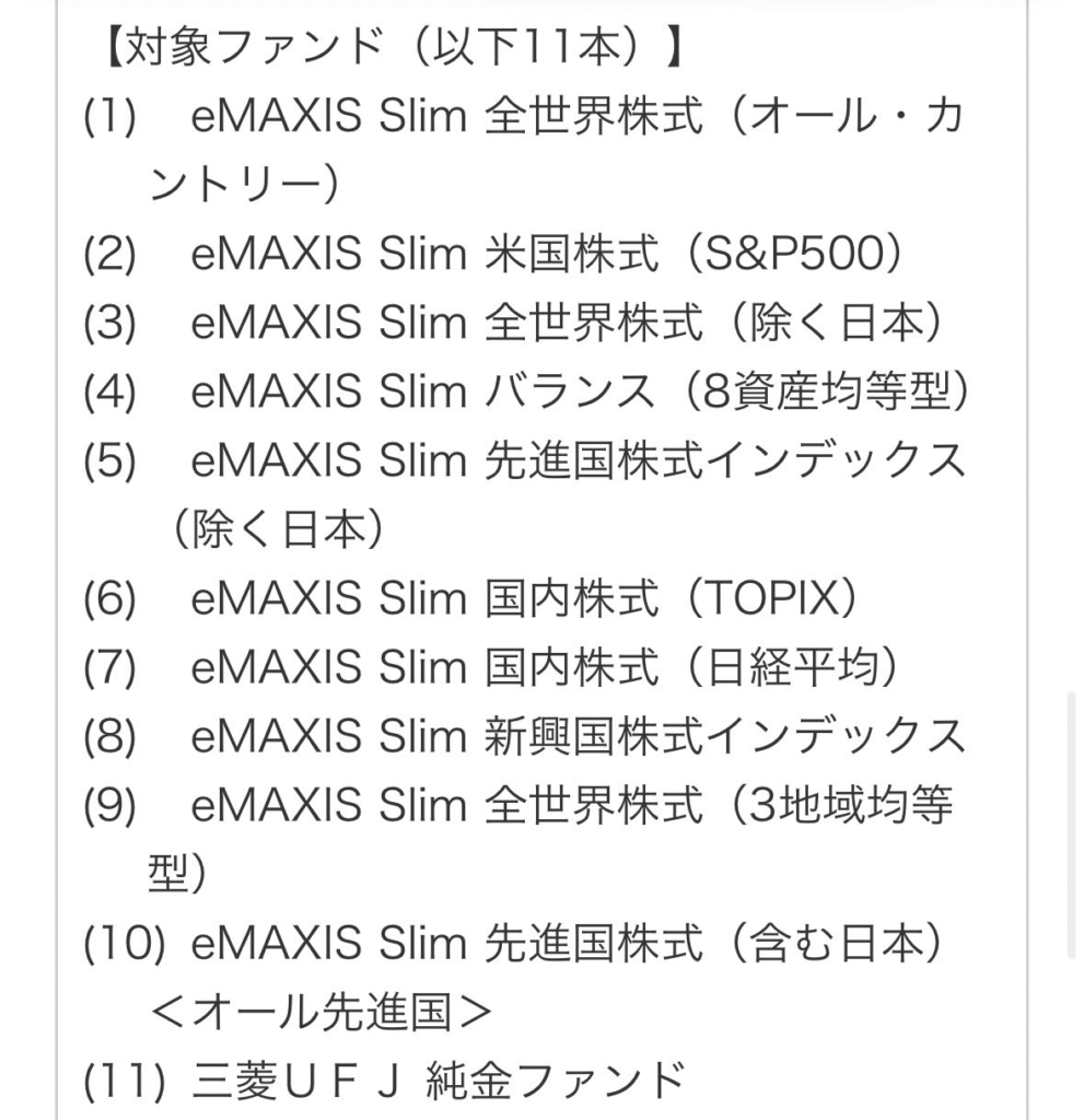 人気のeMAXIS Slimシリーズなどの投資信託を対象ファンドとしたキャンペーンです。