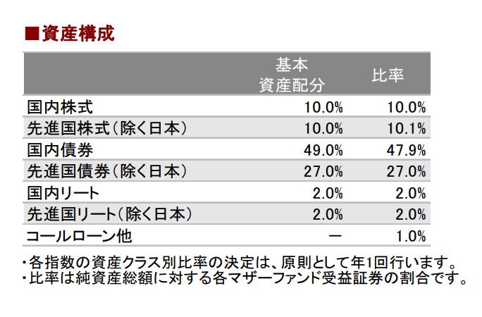運用レポートによると、もっともリスクが低いであろう「マイ ゴールキーパー」の場合の資産構成は以下です。