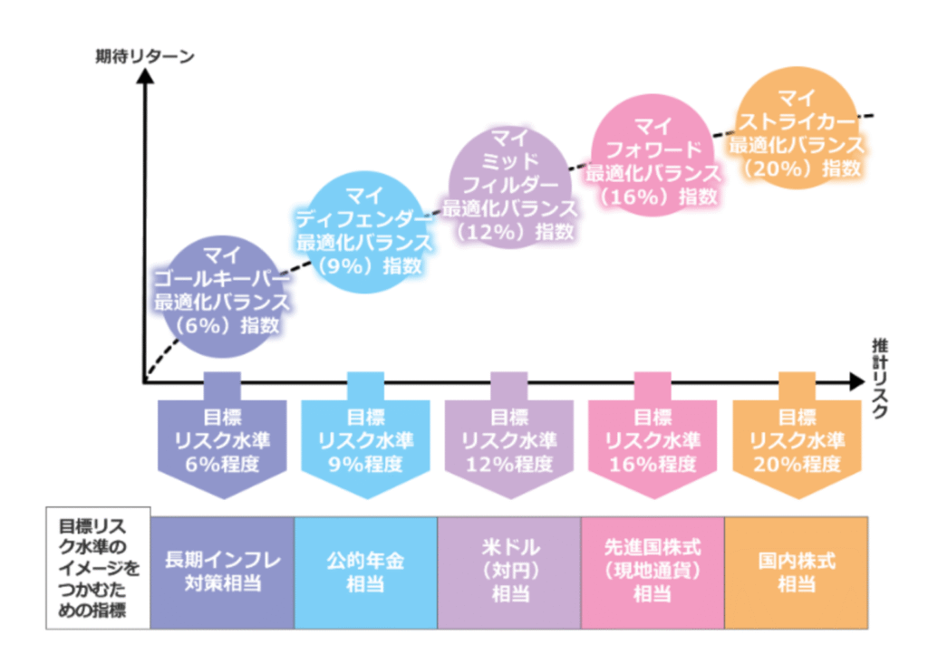 リスクとリターンの異なる5種類の投資信託に分かれます。