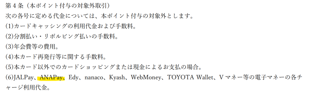 従来はチャージ系の用途にも使いやすかったのですが、前述のとおりJAL Payへのチャージがポイント付与対象外になった後、残された使い道はANA Payへのチャージくらいでした。今回はそのANA Payまでもがポイント付与対象外に。