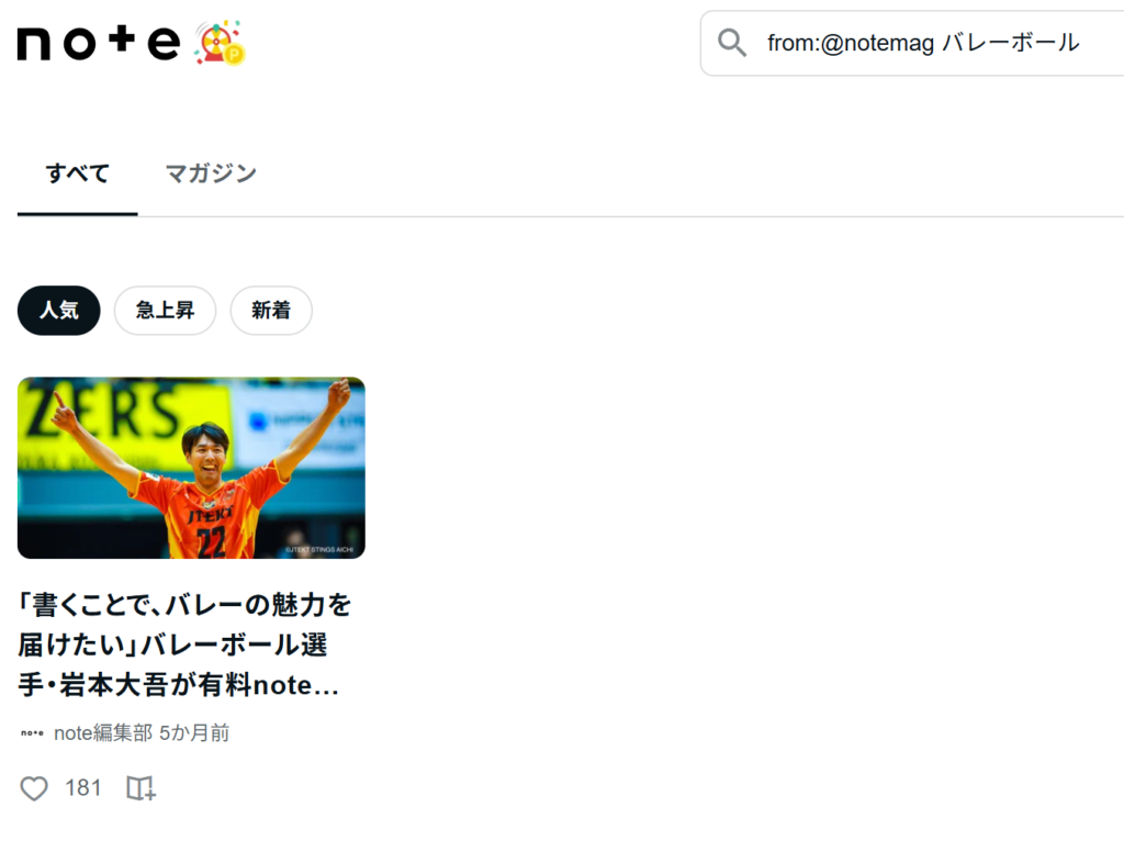 以下のようにfrom:@notemag バレーボールで検索すると、特定のクリエイターの記事の中から、特定のキーワードでの絞り込み検索が可能です。1件だけヒットしました。