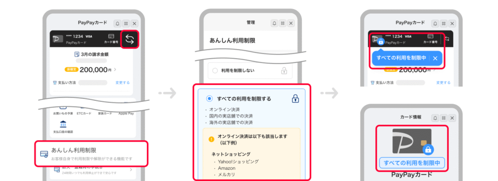 PayPayカードには不正利用対策のための「あんしん利用制限」という機能があり、利用者自身の設定によりカードを使えないようにすることができるのですが、PayPayでの決済(PayPayクレジットの利用)を使えないようにすることはできないんですよね。