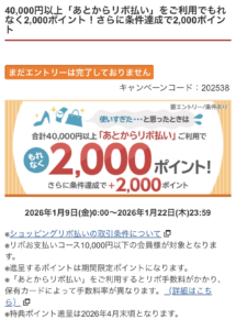 2025年12月26日開始分のあとリボ キャンペーンにて「毎月開催」という表記が追加されています。以前は概ね1か月に2回ペースでした(人によって毎回キャンペーンが表示される訳ではなかったりもしましたが)。