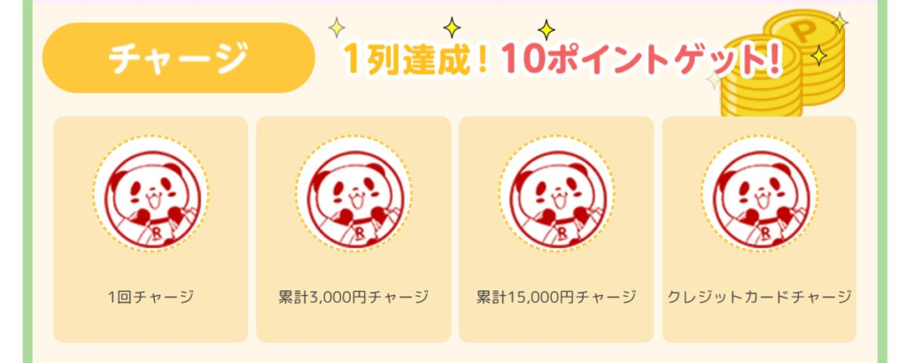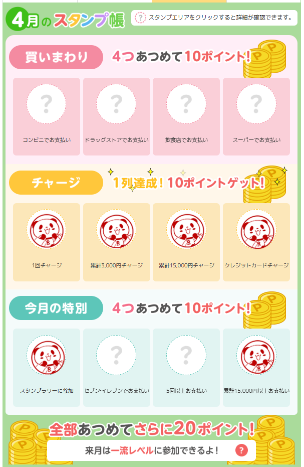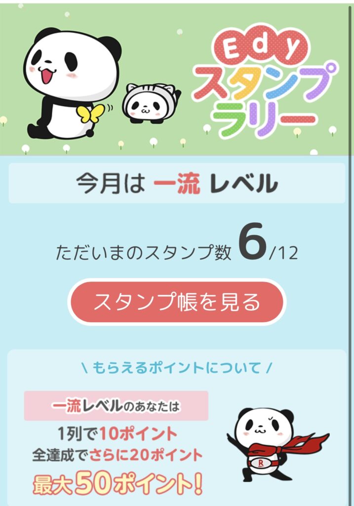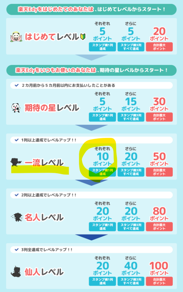 スタンプ帳は以下のような感じです。一番下の段はEdyをちょっと決済に使えば達成できなくもないですね。そうすると名人レベルになって、1列20P×2列達成で40Pもらえるのかな。