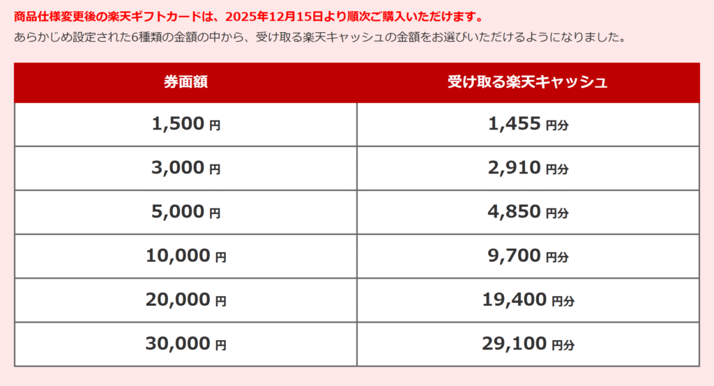 2025年12月15日から販売される予定の新しい楽天ギフトカードは、なんとチャージできる楽天キャッシュの額が購入額から3%目減りする仕様となります。
