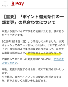 2025年末に大きな改悪が出尽くしたと思って油断していたところに悲報…新年早々に楽天ペイの大改悪です。