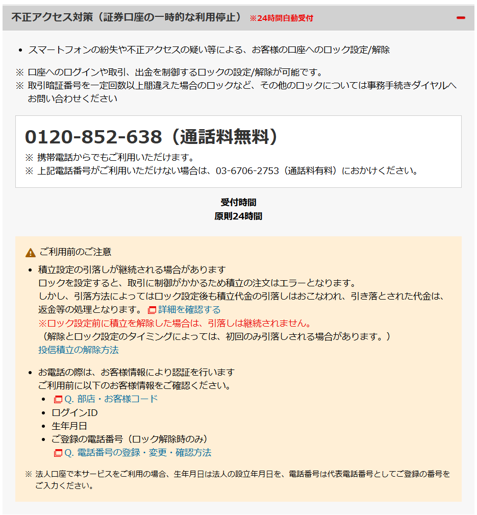 - 楽天証券では、証券口座へのログインや取引、出金を制御するロックの設定が可能(後述の不正アクセス対策ダイヤルにて)