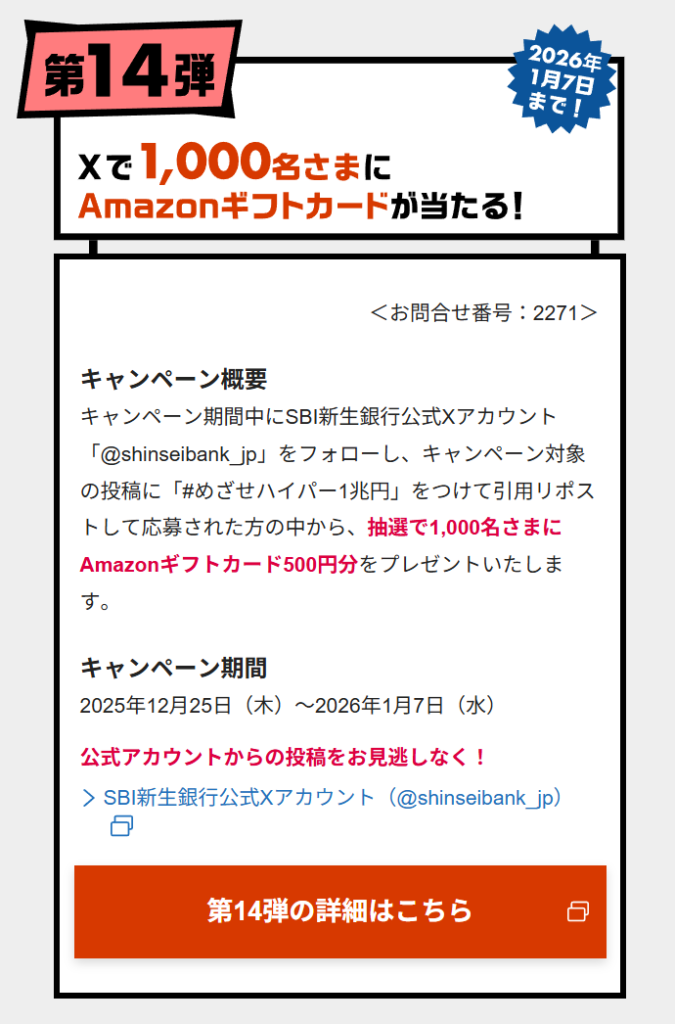 | 第14弾 Xで1,000名さまにAmazonギフトカードが当たる! | 抽選 |