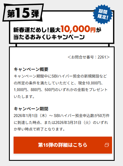 キャンペーン期間中にSBIハイパー預金を新規で申し込む(銀行口座の新規口座開設ではない)をした際の受付番号で当選が決まります🎯ちょっと雑…効率的ですね〜。