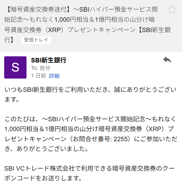 特典は現金でなく暗号資産交換券(XRP)です。2026年2月末の利用期限までに交換券を利用すると、2026年3月末までにSBI VCトレード口座内に(XRPが)付与されます。もしかすると、”交換” の際にスプレッド分で数%程度の目減りはあるかもしれません。