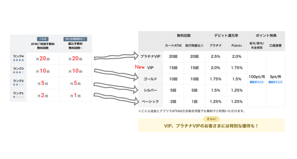 ATM利用や他行宛振込の無料回数で見ると、VIPが新設される格好です。