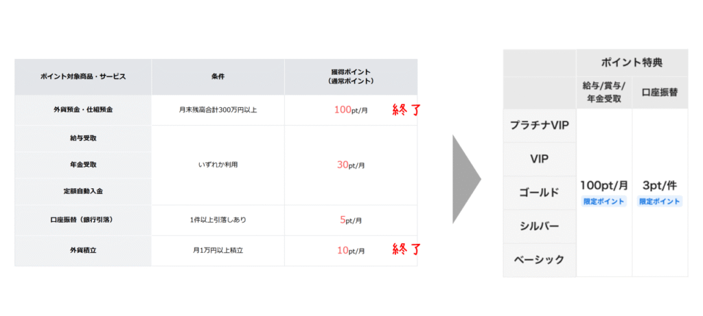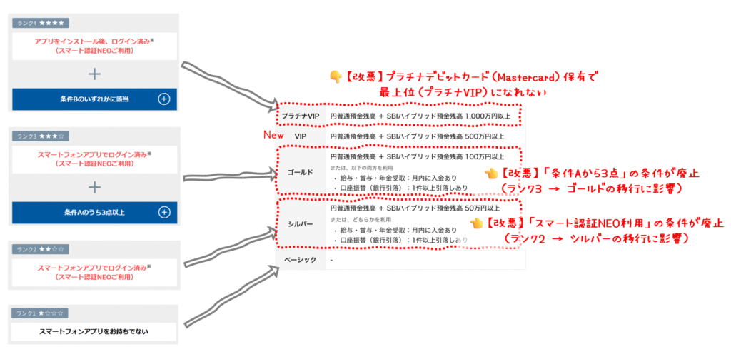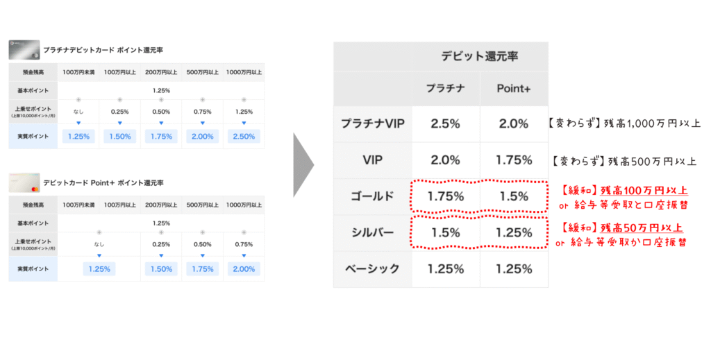 従来は預金残高の額に関わらず所定の条件達成でランク2~3を狙えたり、プラチナデビットカード保有で最上位のランク4を維持できたりしていたのですが、それらの条件が廃止になります。