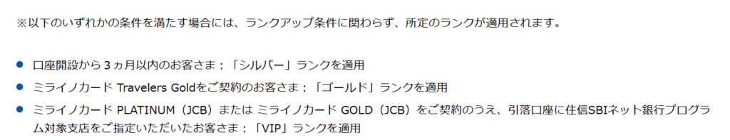 なお、口座開設から3か月以内の場合にはシルバーランク、ミライノカードの所定ランク等でゴールドやVIPのランクが適用されます。