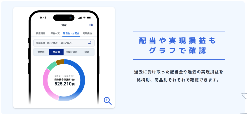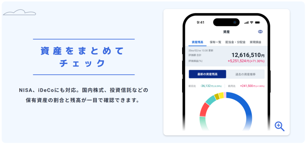 NISA、iDeCoなども含め、国内株式、投資信託などの保有資産の割合と残高が一目で確認できます。