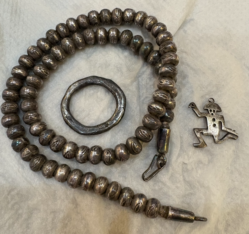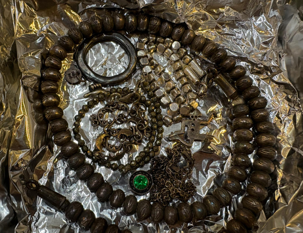 丸いやつ(ペンダントトップ)は、何だったか忘れましたが今回の重曹クリーニングでキレイになったのでシルバーのはず。