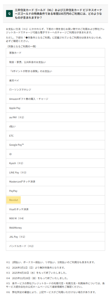 ただ一方で、Mastercardブランドからのチャージで有利となるRevolutだけが残っているのは不思議です。三井住友カード公式のFAQのうち、ゴールドカードの年間100万円の利用の集計対象となるものについての説明ページがあるのですが、ここにはRevolutが2025年12月現在も記載されています。このFAQページ自体は直近で更新されており、JAL Payやau PAY、Kyash、バンドルカードが2026年3月1日に対象外になることや、MIXI Mが2025年11月28日にサービス終了したことも反映されています。